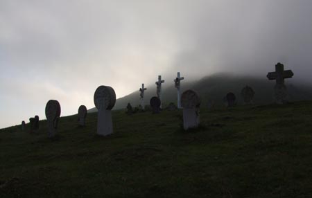 Départ du camping, tout le monde dort encore (y compris le petit jeune qui est arrivé alors que j’avais déjà éteint les feux. C’est celui qui m’a doublé avant Olhette alors que j’avais déjà posé la tente et que j’ai croisé tôt le matin à son réveil…) Les deux hollandais qui étaient au gîte : pas de nouvelles. Montée jusqu’à la chapelle Notre Dame de l’Eglantine avec ses trois croix et son cimetière perdu qui émerge du brouillard… « Vous, ici, dans les épines ! »… c’est la traduction du nom basque de cette vierge apparue y a des lustres : Arantzazu a Onate.