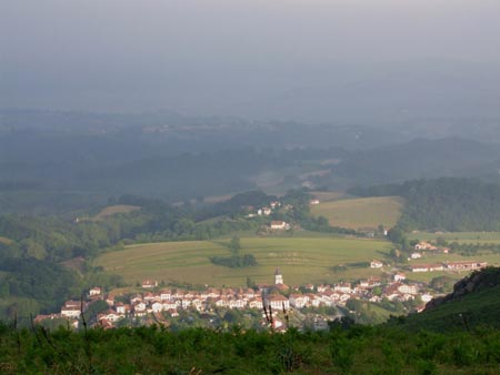 On en deviendrait presque mystique avec tous ces endroits, le cimetière du matin, la vierge de l’aubépine, le saint qui sue et tous ces endroits du même genre rencontrés dans toutes les montagnes que j’ai parcourues. Pas un mysticisme religieux mais un respect et une compréhension de la magie que dégagent certains lieux et que la dévotion populaire s’est appropriée en les habillant de croix, de légendes, de bouquets désuets… et qui accentuent encore leur côté mystérieux et attachant. Très venteuse la terrasse du gîte juste en face de la salle communale où se déroule une fête : musique basque et éclats de rires… Plus loin, au fronton du village, une école de pelote fait jouer des petits jeunes sous le regard fier des papis.