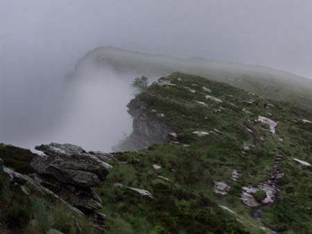 Etape 4 Dimanche 6 juin De Bidarray à St Jean de Baïgori Lever : 6h Départ : 6h40 Arrivée : 13h Durée : 6h15 Asc : 1010m Desc : 1015m Seul le petit bonhomme à charrette et son équipement du parfait petit allumé du pèlerin de St Jacques de Compostelle se lève en même temps que moi. Départ sous un ciel un peu chargé et lente montée bien raide vers le « petit col avec une bergerie en ruine » enfin, je crois, car à partir de maintenant, c’est le crachin, le brouillard puis un vent d’enfer. Ca commence à mouiller vraiment, à faire froid et on n’y voit goutte et pas seulement à cause des lunettes trempées… et je suis toujours en short et t-shirt… finalement j’enfile mon imper mais je reste en short, la flemme de tout sortir du sac. Et je grimpe, le nez sur les balises. Un premier trailer me double : « ça mouille ! » Il me recroise quelques mètres sous la cime d’Iparla. « Vous y êtes presque ! » On discute deux minutes interrompu par le tonnerre, les éclairs. La pluie redouble mais bizarrement le vent a bien faibli. « Panorama époustouflant » dixit le topo guide… il n’ y a que l’ambiance à être époustouflante !