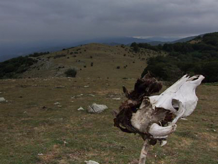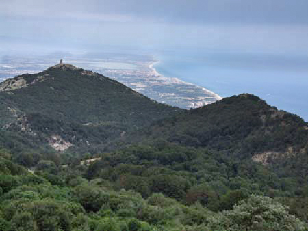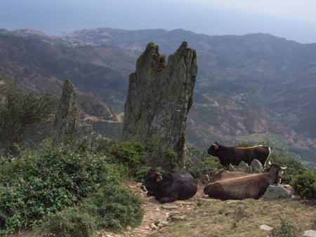 Belle étape, beaux paysages, étrange ambiance que ces vaches à cloches qui se détachent sur la mer bleue. Au loin, les alpages et les chaumes battus par les vents avec des hêtres centenaires puis la courbe de la côte méditerranéenne et la plaine entre elle et moi, plaine bien urbanisée … vraiment étrange, cet endroit !
