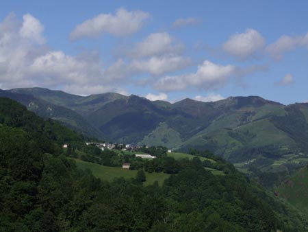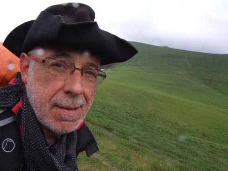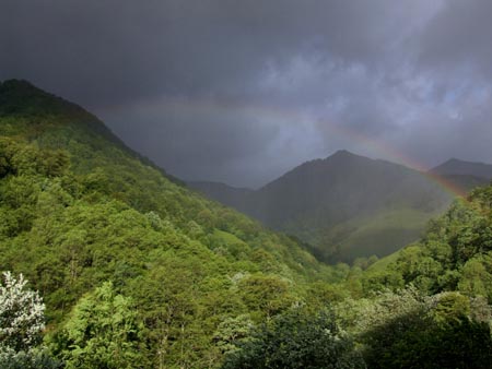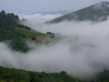 Etape 8 Jeudi 10 juin Du Col Bagargiak au Plateau d'Ardakhotchia Lever : 6h30 Départ : 7h27 Arrivée : 13h40 Durée : 6h09 Asc : 810m Desc : 1235m Très mal dormi : c’est la deuxième nuit consécutive où j’ai du mal à m’endormir… énervé des pieds ! Ce matin, vent très violent et les sommets sont dans les nuages : on avance en apnée quand on est face au vent et il faut faire attention aux courants d'air : y a de quoi se retrouver les quatre pattes en l'air... Je traîne pas trop et commence la descente sur Larrau (variante mauvais temps, les bourrasques sont trop violentes). Après deux malheureuses tentatives de trouver le chemin (non balisé qu’ils disaient…), je termine par la route sous de belles averses et de beaux arcs en ciel.