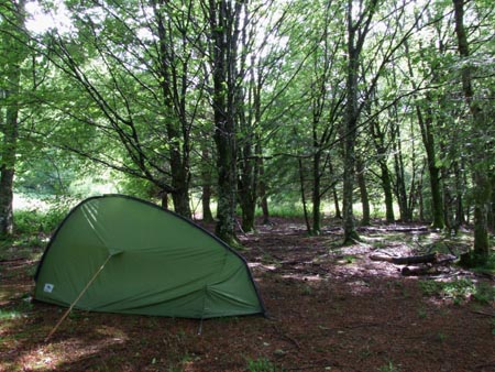 De petites averses intermittentes, mais ça monte bien. Je monte la tente dans les bois juste sous le débouché du plateau d’Ardakhotchia. C’est con car la vue y est sublime mais c’est un coup à se faire arracher la tente tant les bourrasques sont violentes. Cassez croute, sieste, pluie… Je profite d’une accalmie pour remonter jusqu’au col et je retrouve mes deux anglais qui cherchent un coin où planter leur tente… ils le trouveront pas trop loin de ma tente. J’ai fait le con avec l’eau… Pas assez pour les nouilles chinoises… je me contente d’une soupe et d’un café tout en regardant passer cinq vaches que ma présence a l’air de troubler, sauf pour celle qui mène le groupe. 18h27 : je vais lire quelques pages et carpette ensuite.
