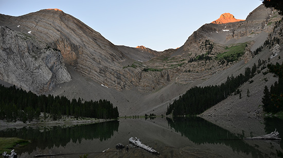 Départ 6h50. Aucune ride ne vient troubler les eaux du lac, ce matin. Les premiers campeurs se réveillent et moi je reprends mon chemin. Impossible de trouver les balises et je traverse donc le bois de sapin un peu comme je le sens. Au-dessus, le sentier est à nouveau bien marqué et grimpe vers le col.