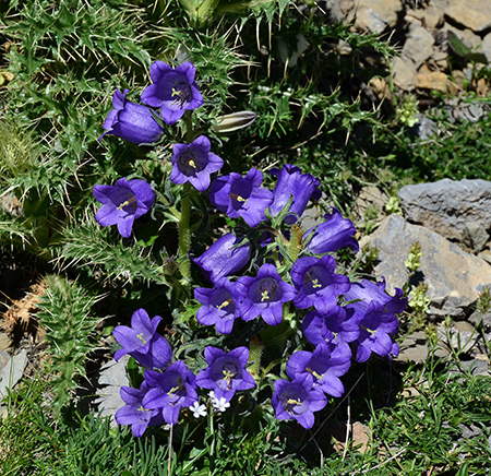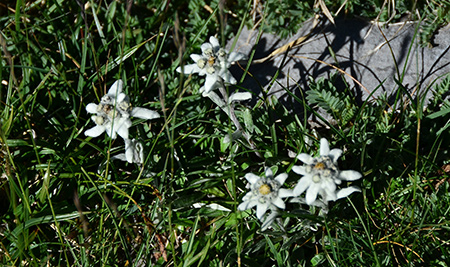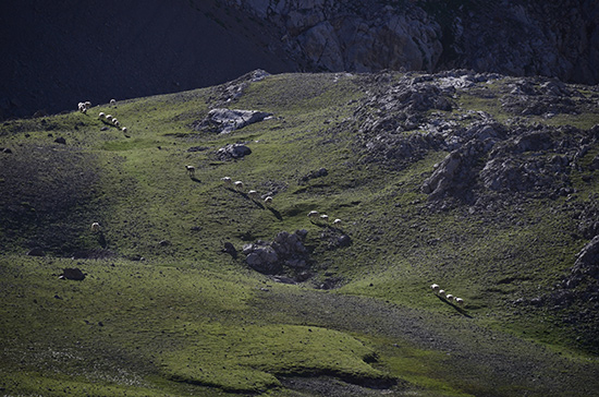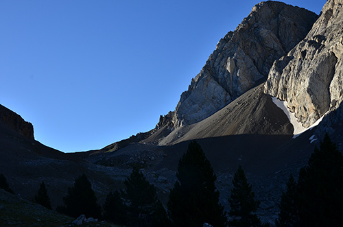 De nombreux édelweiss et un isard saluent mon arrivée au colladeta l'Ibon. Le soleil éclaire déjà le versant ouest et des files de moutons soulignent les courbes de la combe, en contre bas. La descente se fait un peu à l'aveuglette, justes quelques cairns discrets et des balises par ci par là. Faut sortir carte et GPS et faire gaffe de ne pas s'enfiler dans le mauvais vallon. Au loin, j'aperçois deux randonneurs qui montent vers moi. Deux randonneuses, en fait (je ne peux pas entendre une espagnole parler français sans penser à quelqu'un...). On s'enquiert mutuellement de la direction à suivre.