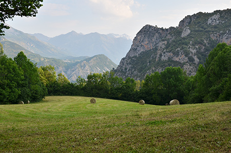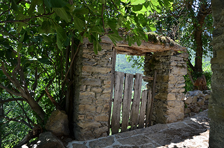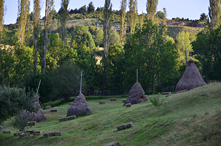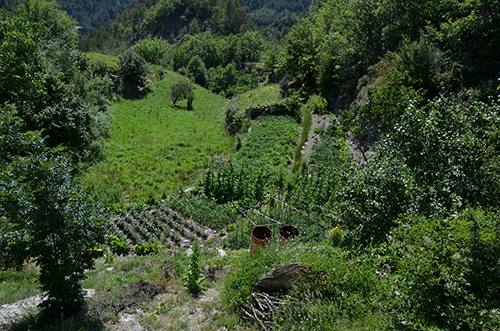 Refuge de l'Armena, enfin un vrai refuge, table, bas flancs, tout ce qu'il faut ! Même un poste radio de secours ! En quittant le refuge, nez au sol, sur un sentier bien marqué et en suivant les traces fraîches d'un groupe qui vient d'arriver, je tombe sur un lac ! Ce n'était pas prévu au programme et j'ai du louper le GR15... D'après la carte, je suis sur un sentier qui rejoint des pistes, bien plus bas. Je persévère donc, dans l'erreur. Et cette descente n'est pas trop mal finalement, sauf les derniers kilomètres de pistes jusque Barbaruens. Encore un joli village avec ses passages couverts, ses figuiers et leur ombre salutaire, ses chiens allongés dans les ruelles.
