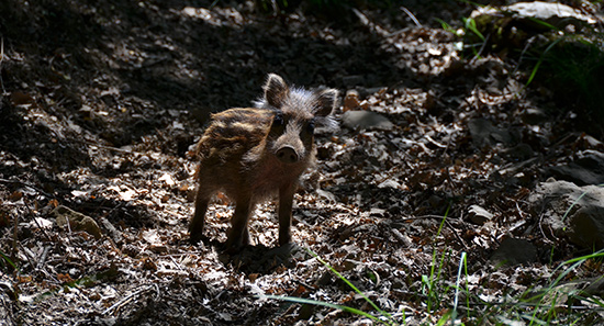 45° et il me faut continuer. Je mouille mon foulard et mon chapeau pour garder la tête au frais. Un jeune marcassin déboule devant moi... Curieux, il s'approche et me regarde d'un air presque effronté. Je sors l'appareil photo en espérant que la mère ne traîne pas dans le coin...