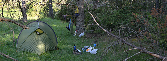J'ai la chance d'avoir pu trouver un bon endroit de bivouac à Las Fonts, une petite clairière ombragée juste à côté de la source. L'eau sort d'un réservoir en béton et me semble bonne, fraîche, en tout cas. Le camp monté, je me fais un bon gros thé et une bonne sieste dans la tente. Bien qu'elle soit montée à l'ombre, il y fait très chaud quand même... Il est 20h. J'ai fini de manger (soupe et nouille) et il commence à faire bon !
