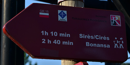 De Castejon à Las Fonts. J23 D+, 825m. D-, 295m. 5h45. 13km Départ 6h30. Je monte vers Gabas où plusieurs chiens viennent me renifler les mollets. Je retrouve le balisage récent qui s'était interrompu à Tella (panneaux, fléchage, balise... le nec plus ultra !).