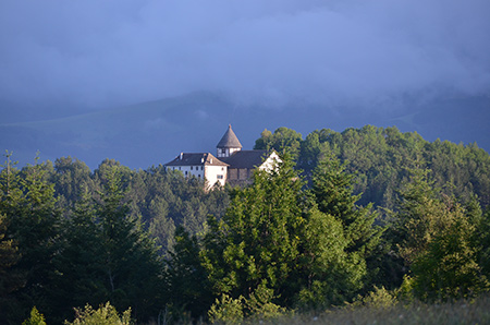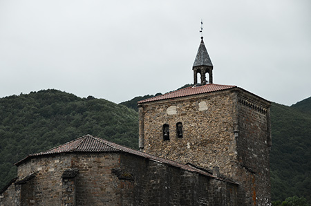 Petit arrêt obligatoire au sanctuaire de Nuestra Senora de Idoia pour y trouver ma première géocache. Ce petit monastère est en train de tomber en ruine. Depuis le passage de Paul Lucia, le GR11 ne le traverse plus et le contourne. Un peu avant, un chantier de création de piste forestière rend la progression un peu difficile. Obstacle ponctuel qui sera sans doute vite résorbé. Beau village d'Isaba avec son clocher atypique et le drôle de son métallique et mat que font les cloches.