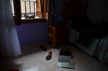 Je quitte Ochagavia à 6h40, sur la pointe des pieds. Tout le monde dort encore. Les espagnols ne sont pas très matinaux. Faut se faire à l'horaire espagnol. Rien ne bouge avant 8 heures. De midi à 16h, non plus et les restos, le soir, rien d'ouvert avant 20h30. Je m'en fous, il me reste encore de cet excellent saucisson acheté à Irun ! J'attaque la piste qui monte derrière la scierie (fabrique de meubles rustiques). Deux bergers en 4X4 me doubleront en me saluant d'un petit signe de la main. De la piste et encore de la piste... Dans ce cas, vaut mieux regarder ses pieds que devant soi.