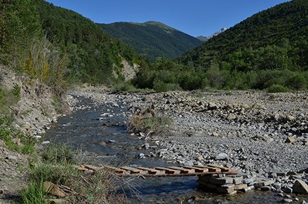 J'attaque mon premier col de la journée. Colluguané est modeste mais bien pentu tout de même. Puis, descente bien raide mi piste mi sentier jusqu'à la passerelle qui me permet de traverser le rio Aurin avant de monter sur Acumuer. Je croise une famille qui descend vers le rio, suivie de près par le papi qui surveille ses ouailles.