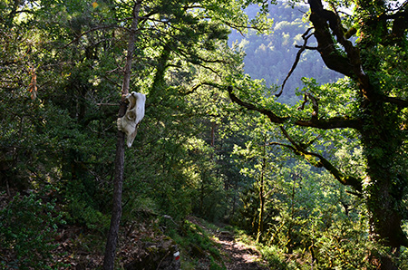 Je descends en larges lacets vers la passerelle. Le torrent gronde de cascades en cascades. L'eau est verte sous les premiers rayons du soleil. Je croise une petite fontaine un peu avant l'ermitage de san Urbez où arrivent les premiers touristes. Le parking se remplit. Mais le GR15 quitte la foule et va grimper de 1000m pour sortir du canyon. Pause casse croute vers 1100m. Finalement, les grosses montées, j'aime ça. Un petit rythme lent et régulier et ça passe bien... dans la mesure où le sentier est bien marqué et qu'il n'y a pas à réfléchir où poser son pied.