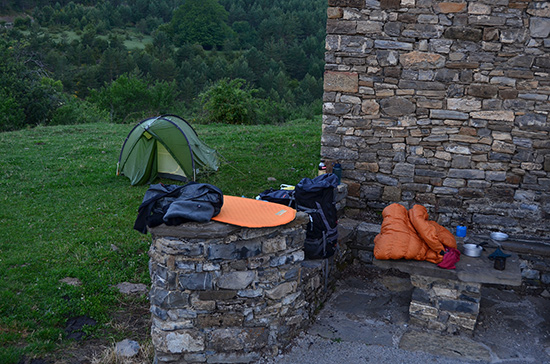 Je traverse Fanlo sans rencontrer âme qui vive ni fontaine ! Je continue donc, un peu juste en eau, et descends sur Buisan. Encore un village abandonné mais en cours de restauration celui là. Et, miracle, une fontaine, un banc, une table et un magnifique coin plat pour la tente ! Journée bien remplie, je n'irai pas plus loin.