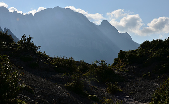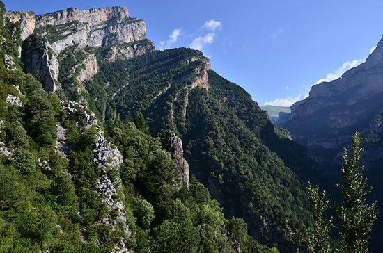 Le canyon d'Anisclo commence à se dessiner devant moi : des barrières rocheuses noires en contrejour barrent l'horizon. Puis, la bête est enfin là ! Je pose le sac juste au moment où le sentier s'apprête à plonger dans cette entaille hors du commun. Quelques rapaces tournoient autour des falaises, jouant avec les premiers courants ascendants de la journée. Les ombres du matin se retirent dans des endroits connus d'elles seules.