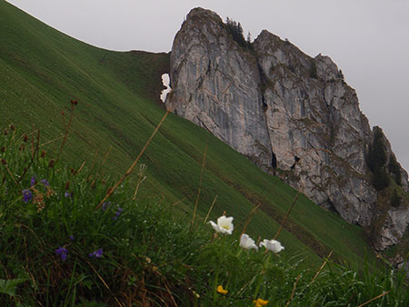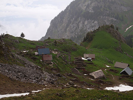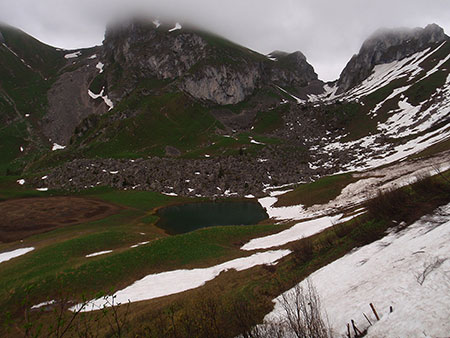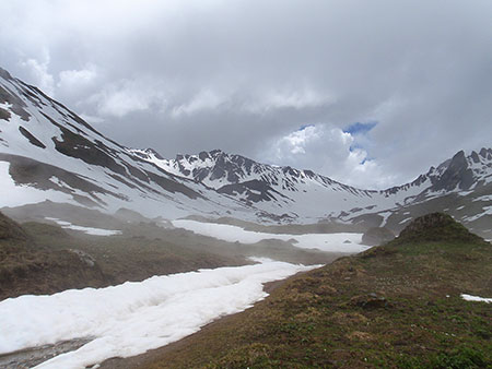 Je ferai encore une tentative le 8 juin. Mais la montagne est gorgée d’eau, pluie et brouillard. La neige omniprésente cache les marquages, la trace n’est pas faite. La montagne n’est pas si moche sous la pluie. Les chamois, marmottes sont là pour me le confirmer mais, ce soir, devant ma tente, je décide d’arrêter. J’ai quand même fait un beau parcours. Je quitte le chemin au pied d'un col que je devine à peine dans le brouillard... Dire qu'il aurait suffit de quelques traces dans la neige pour que je tente le coup ! Sûr que je vais récidiver… il me reste encore du temps et des semelles !
