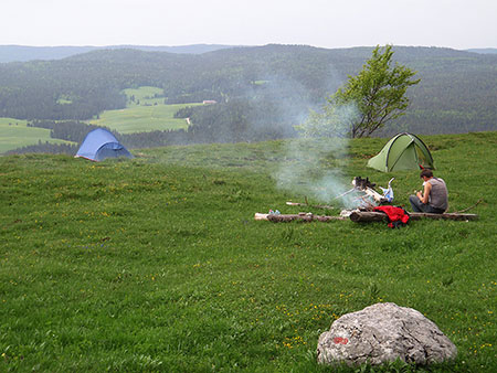Longues tirées dans les bois sur des routes forestières qui n’en finissent pas… Pause bistrot à la Chapelle des Bois où Laurent tient à me faire goûter la gentiane locale. Elle va nous donner des ailes et la grimpette jusqu’à la Roche Champion passera comme une lettre à la poste ! Pas déçus du voyage… là haut, on a une vue d’enfer sur le Jura et le soleil parvient à prendre le dessus. Super bivouac sur la corniche. On se paye le luxe d’un petit feu où Laurent nous cuit quelques saucisses de Montbéliard… Il ya des coins et des moments sublimes…
