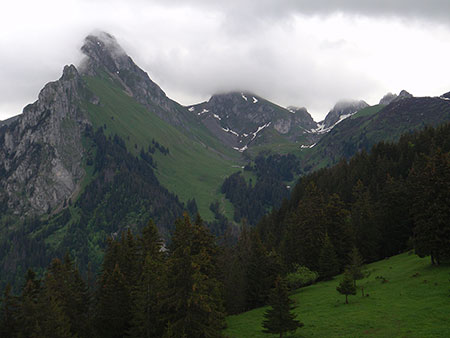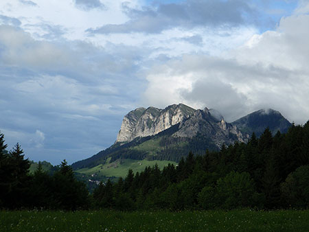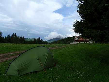 Le paysage devient plus montagneux même si les nuages se la jouent très capricieux. Ce soir, c’est alpage avec des sommets illuminés par le soleil. Bivouac à côté des chalets des Trables. Pas de point d’eau si ce n’est qu’un petit goutte à goutte d’une eau un peu trouble.