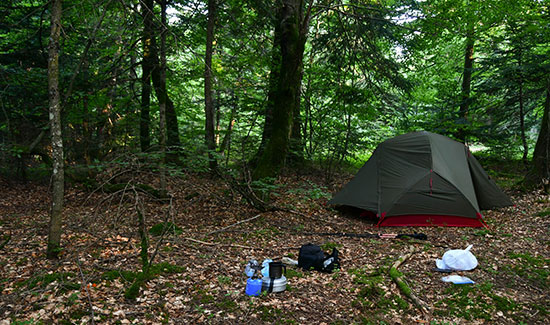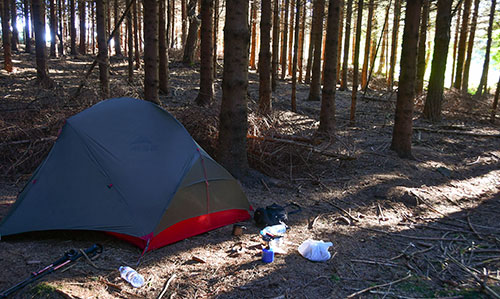 Saint Agrève, beau gros bourg où je m’installe à la première terrasse et j’en profite pour repartir avec deux bons litres d’eau. Ça me suffira pour la fin de la journée, le repas du soir et le café du matin. Après, je suis un peu perdu dans le cheminement… ma carte et les balises n’ont pas l’air de coïncider. Je ne me pose pas trop de questions et me contente de suivre les traces rouges et blanches. Et c’est encore un bois de sapin qui m’accueillera. J’aurais bien aimé quelque chose de plus ouvert comme paysage mais je n’ai pas vraiment le choix. La tente est donc plantée à un endroit que j’ai du mal à situer avec précision sur ma carte au 1/50 000 ème.