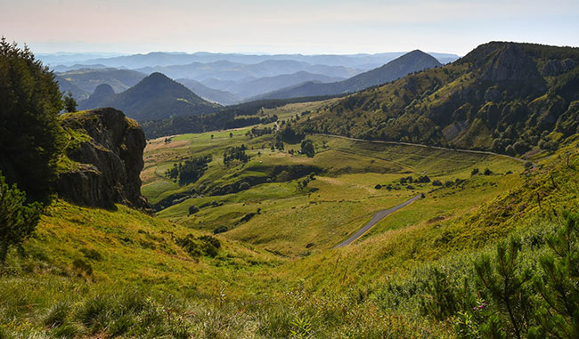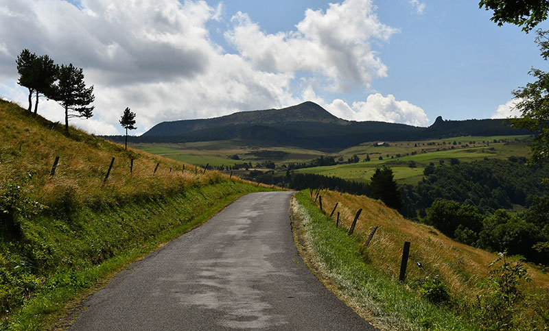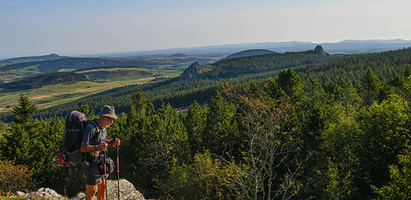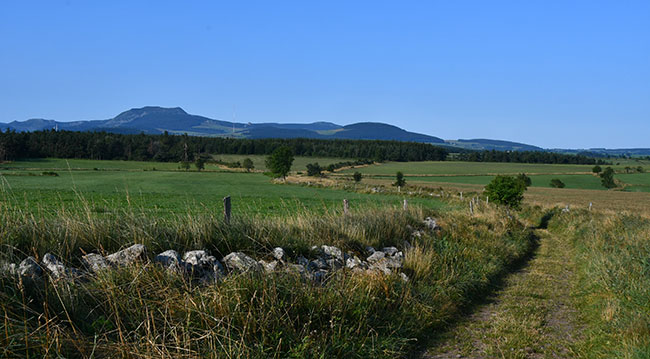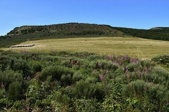 Le GR contourne le sommet du Mont Mézenc et monte vers les Roches des Cuzets qui offrent un superbe panorama sur un ancien cratère de volcan.