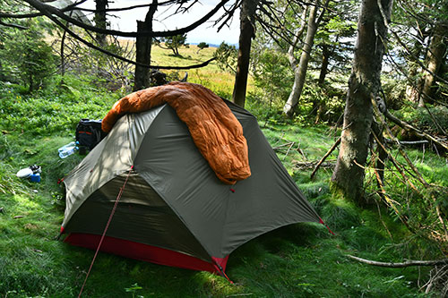 Je plante la tente sous le sommet du Mont Mézenc, au pied du Croc du Diable, « locus horribilis » ainsi surnommé depuis l’Antiquité. Des crashs d’avions, de nombreux phénomènes inexpliqués, ce « Triangle de la Burle » a fait couler beaucoup d’encre… il fallait absolument que j’y plante la tente. Bonne nuit !!