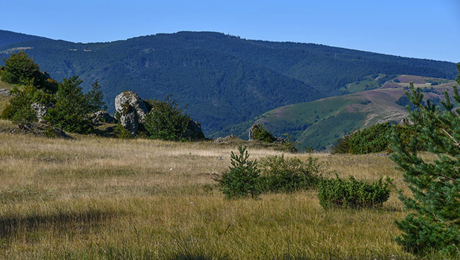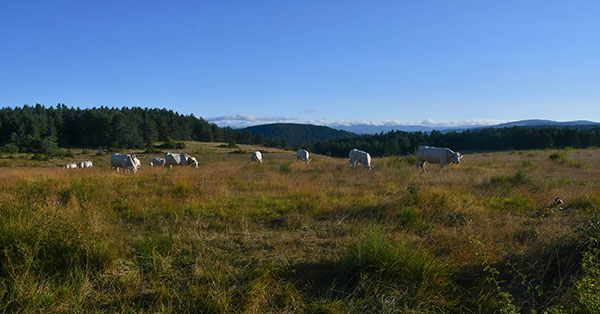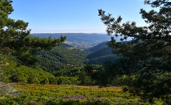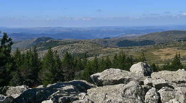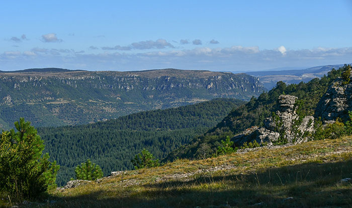 Beau parcours sur la Corniche des Cévennes avec ses enfilades de barres sur lesquelles j’ai joué à saute-mouton mais moins rapide qu’eux. Une ligne de crête, c’est bien mais ça n’arrête pas de monter et de descendre… Les vautours tournoient au-dessus des pâturages.