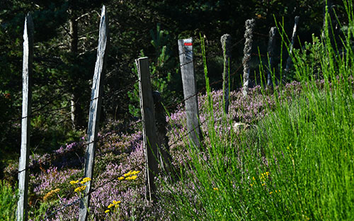 Après la traversée de la voie de chemin de fer, j’opte pour la variante GR7A. Montée régulière puis ligne de crêtes le long des éoliennes dont je n’aperçois pas les pales mangées par le brouillard. Je croise trois petits marcassins, truffes au sol, grognant et marchant à la queuleuleu.