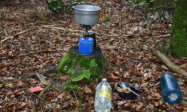 La forêt est bien sereine, de matin, de soir comme de nuit. Quel plaisir d'y jouer le vagabond qui plante sa tente quand il veut, où il veut ! Et, pour la bouffe, c'est pareil. Je ne me casse pas la tête. Ni gastro, ni diététique ! Faut dire que je n'ai pas vraiment le choix. Il n'y a guère d'endroits pour se ravitailler, à moins de quitter le sentier et descendre vers de gros villages. Mais je préfère improviser avec ce que j'ai plutôt que de faire des détours. Ce soir, ce sera une tasse de soupe et le reste du pain. Les autres jours, c'est du pareil au même. Quand ça va bien j'y ajoute une polenta ou de la semoule, du genre ciment à prise rapide... mais cà colle au ventre et le lendemain, la machine est prête à repartir ! Le matin, la première chose à faire c'est le café que je sirote tout en rangeant le camp et en fumant la première cigarette de la journée. Au cours de la journée, un quignon de pain avec du fromage ou quelques copeaux taillés dans le morceau de viande séchée que je traîne depuis le début. Sans compter les mûres abondantes et délicieuses en cette saison.