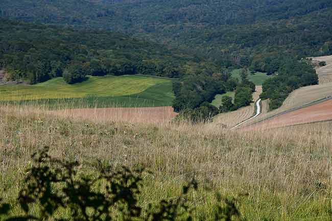Lundi, 26 août. 8h30 à 14h45. 6h15. Départ du camping à 8h30 après un petit déj tardif. La journée débute par une longue et belle descente au fond d'un petit vallon. La journée s'annonce chaude et je mouille le tshirt en gravissant la Butte de Vergy.