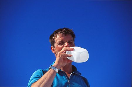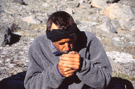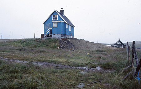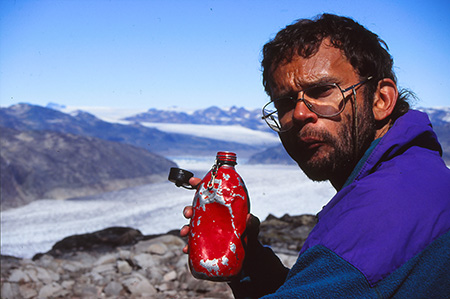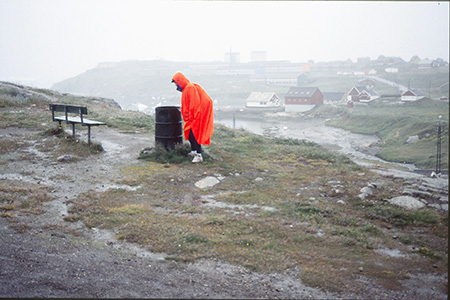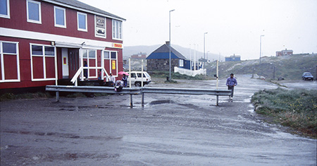 La célébrité nous ayant précédés, un grand gaillard nous accueille avec un « c’est vous les 4 français qui avaient traversé le glacier ? »… On finira la soirée avec lui à l’auberge de jeunesse. C’est un guide trek (Groenland Travel) intéressé par des renseignements sur les glaciers qu’on a traversés. Il nous offre le café et un gâteau énergétique fait maison… Il pleut toujours dehors… on remonte la tête dans les épaules vers notre tente. En tatant mes poches, je ne trouve plus ma pochette. Mais il pleut tellement que j’attends d’être dans la tente pour tout retourner. Pochette disparue ! Je sors refaire le chemin en sens inverse tandis que Bernard retourne en courant à l’hôtel… Rien !! Il y a mon passeport, billet d’avion pour le retour et une coquette somme en liquide. Mercredi 2 aout. Nuit courte et mauvaise. Vers 5h30, je refais le chemin de jour, visite quelques poubelles, rencontre des ouvriers fantomatiques qui quittent l’usine de poissons. Il pleut. On retourne à l’hôtel. Il n’y a que des groenlandais qui pigent que dalle. A l’office du tourisme, une jeune fille téléphone aux flics de Narsaq. Je téléphone à Maif assistance qui ne peut que me conseiller d’aller chez les flics pour le passeport et à la compagnie d’aviation pour les billets. Les flics enregistrent la plainte, l’office du tourisme nous offre café et petits gâteaux. Il pleut. Quelques boutiques mais j’ai pas trop la tête à ça. En retournant une dernière fois à l’hôtel, on passe à quelques mètres d’une poubelle… Bernard fait un détour pour y jeter un coup d’œil… ma sacoche s’y trouve !! Tout y est sauf l’argent.
