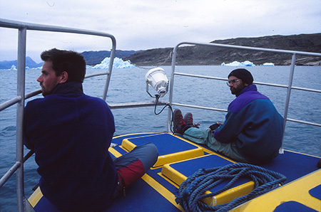 Lundi 31 juillet. Encore une journée à faire des tours et des détours. Des barres rocheuses, des descentes, des contours et pour finir une grimpette qui nous a mis hors d’état de nuire… On se retrouve au bord du lac des premiers jours. La boucle est bouclée. Pose du camp vers 15h (j’aurai eu du mal à en faire plus). Bernard est dans l’eau… le temps se couvre à l’horizon, le vent souffle, le réchaud fait des siennes, quelques randonneurs passent au large de nos tentes… Mardi 1 er aout. (17h15, dans le bateau pour Narsaq)