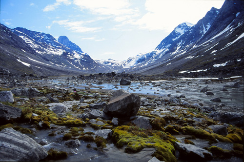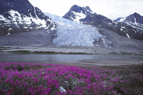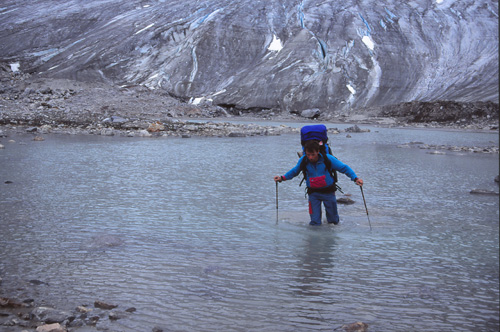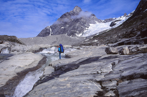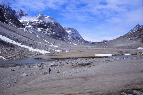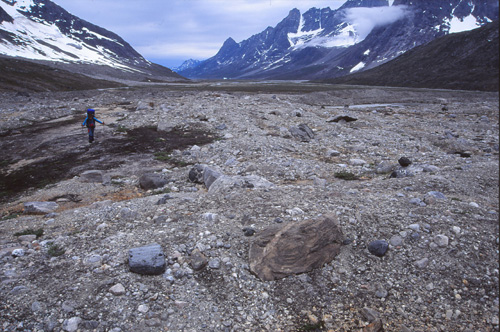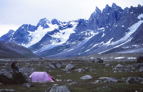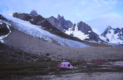21h15. 11° Le nouveau camp est installé au milieu d’une féerie de couleurs, de formes, de pics et de glaciers, de torrents et de plages, de fleurs de toutes sortes. Pour y arriver, la marche s’est faite assez pénible parmi un enchevêtrement de moraines latérales et frontales qui descendent des glaciers venant se jeter dans la vallée. Un chaos de blocs et la Tasiilaq serpente au milieu de tout ça… et nous aussi !