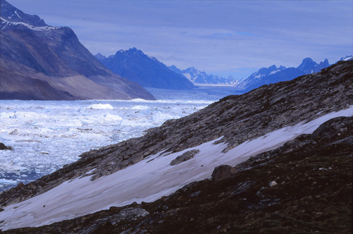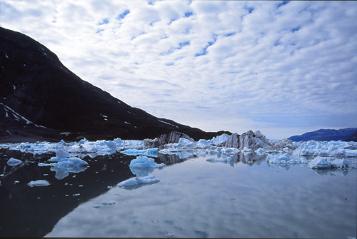 Jeudi 21 juillet. 20h15. 340m. 12° Le vent vient de tomber. Le ciel est couvert. Balade de 8 heures : descente depuis le col par des névés et puis trois heures pour atteindre le fjord qui nous accueille par un chaos d'icebergs de toutes tailles.