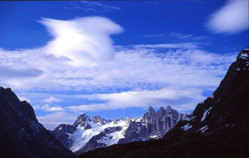 Mercredi 27 juillet. 17h55. Après une petite averse, le ciel est en train de se remettre au beau. D’un promontoire au-dessus de Tasiilaq, on a vu se dessiner à l’horizon un véritable décor de dessin animé à la Walt Disney. J’ai mis un peu de temps à faire le rapprochement mais c’est tout à fait ça, ce bastion montagneux (Trilingerne et le Pikkelhuen) semblable à un vieux château surmonté, dans le ciel, d’une foule de nuages étranges, le tout baigné d’une lumière tamisée et irradiante.