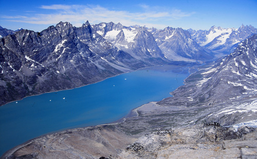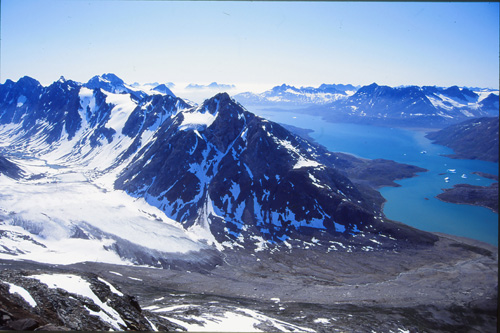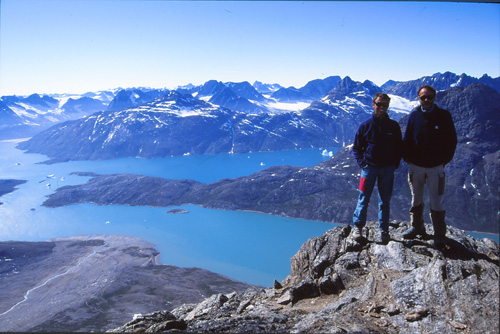 Jeudi 28 juillet. Sommet « 1000 » qui domine l’entrée de Tassilaq. Départ du camp assez matinal, 9h… lente montée sur les terrasses au-dessus du camp puis névé. On en profite pour refaire le plein des gourdes. Arrivée somptueuse à l’entrée d’un cirque glaciaire. Longue boucle sur le glacier pour atteindre l’arête NE du « 1000 » parsemée de filons de mica noir, blanc, rouge étincellants au soleil.