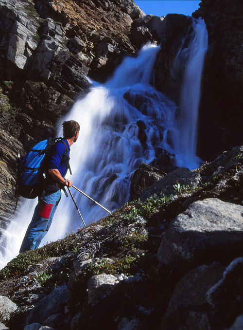 Vendredi 29 juillet. Toujours au camp 6, assis sur notre belvédère, la gueule au vent pour ne pas avoir à affronter les moustiques. Le fjord est à mes pieds avec un nonchalant iceberg et, au loin, les tours de Walt Disney. La journée a commencé dans la brume, plafond bas au droit du fjord. Départ pour la course prévue annulé. J’en profite pour aller à la cueillette de bois sur la plage. Mais le temps se remet au beau et on en profite pour partir vers 10h30 en direction du lac entrevu la veille et, là-bas, on verra.