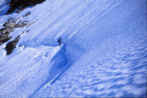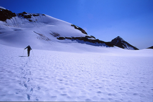On se retrouve à l’entrée d’un nouveau cirque glaciaire protégé par une muraille de séracs qu’on longera en faisant le plus vite possible. Au-delà, c’est une sensation de calme et plénitude dans un univers tout blanc aux formes blanches et arrondies que seule la neige sait dessiner. On y croisera une vieille piste animale sur le chemin du dôme de neige qui s’élève juste à la ligne de partage entre deux cirques. Belle arête sommitale, parfaite pour la photo !