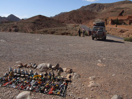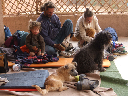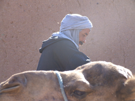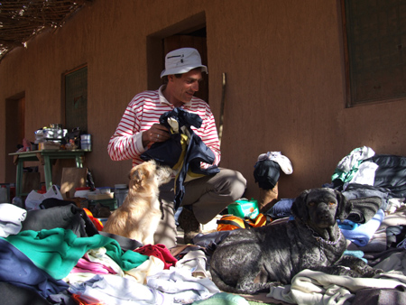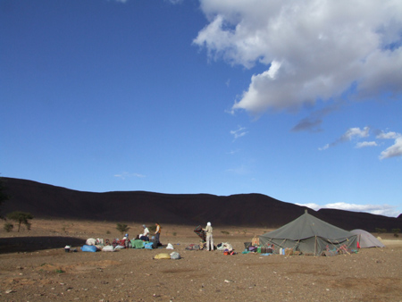 On escalade la porte, passage des sacs au-dessus du mur et finalement on rencontre un des fils de Mohamed. Thé et dodo sur la terrasse. Vendredi 31 octobre. Thé autour des retrouvailles avec Mohamed, Ahmed et les autres… Tour en ville et arrivée de Yannick au camping. Grand déballage du Toyota et des merveilles textiles et autres récupérées dans les poubelles suisses. Préparation de la méharée.