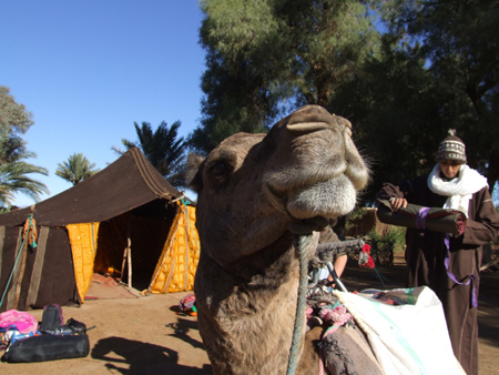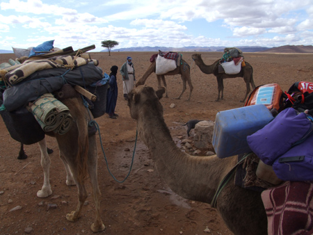 Dernière nuit sur un lit et sous un toit. Lundi, 3 novembre. (De Zagora au bivouac 1) Départ du camping vers 11h. Chacun choisit sa monture, et arnache tant bien que vaille ses affaires perso. Traversée du camping à pied et on retrouve les chameaux dans l’oued Draa. La caravane se met en route : 8 chameaux, 4 marocains et 5 roumis. On traverse le bas de Zagora en empruntant les trottoirs puis cap plein Ouest sur une piste parallèle à celle qui relie Zagora à Foum Zgid.