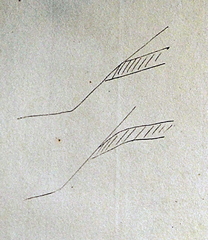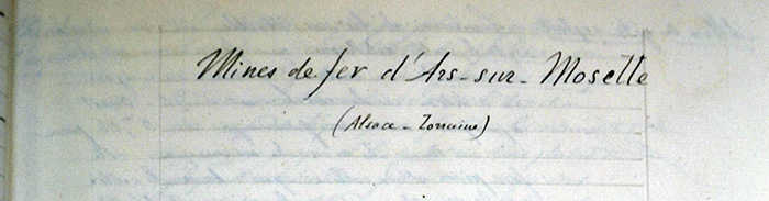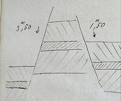 Le filon de minerai.« Le minerai d’Ars est un minerai oxydé hydraté oolithique qui forme une couche d’environ 2 m d’épaisseur moyenne. La direction de la couche est d’est/ouest avec un pendage de 0,04 m pour 1 m. La couche est unique. Dans le voisinage de l’affleurement, le pendage augmente :