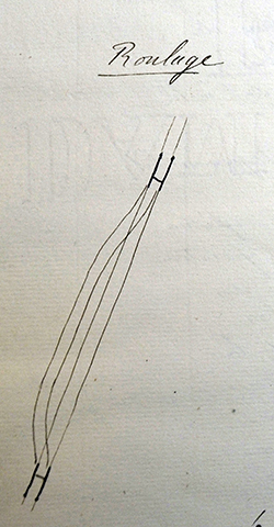 Le roulage.« Le minerai abattu est chargé dans des wagons dont chacun tient 1000 kg de minerai. Les wagons sont poussés sur rails par des rouleurs qui les réunissent par trains. Des chevaux achèvent l’extraction. Chaque cheval tire 11 wagons. De temps en temps, on établit des gares pour permettre le croisement des trains. Les trains arrivés au carreau sont envoyés aux estacades par groupe de 3 ou 4 sur le plan incliné. » Note : Je n’ai pas pu vérifier ce schéma sur le terrain. Mais dans la galerie de la Mance, j’ai pu observer ces gares qui ne sont qu’un élargissement de la galerie. Une des parois conserve son alignement alors que l’autre est surcreusée.