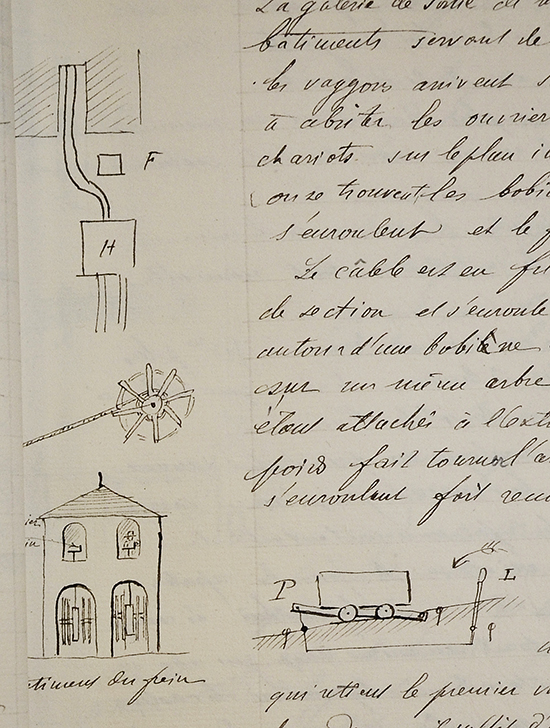 « Le câble est en fil de fer ; il a environ 6 cm de section et s’enroule en haut du plan incliné autour d’une bobine. (Cf. ci-dessus) »