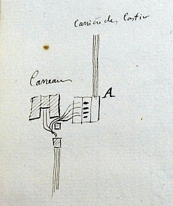 L’aération.« Le ventilateur n’est pas nécessaire. Le courant d’air s’établit naturellement par la galerie principale d’entrée de la mine, fait le tour des travaux et sort par un puit d’aérage. » Note : Ce puits d'aérage est encore visible sur le plateau mais ne communique plus avec les galeries.