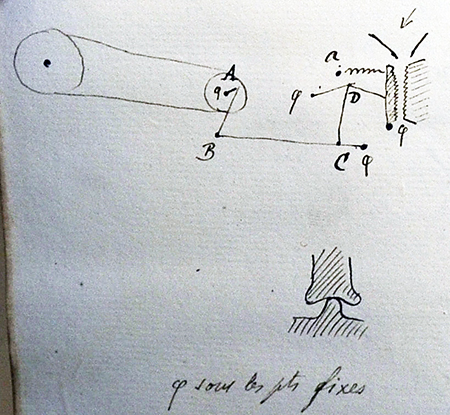 « Fonctionnement du broyeur de castine (schéma ci-dessus) : un arbre en A imprime au moyen d’une bielle et d’une manivelle un mouvement d’oscillation à la pièce BC fixée à l’une de ses extrémités. En C, se trouve une articulation de sorte que finalement le point D s’élève et s’abaisse alternativement. En ce point, sont articulées deux bielles dont l’une est fixée à l’autre extrémité et la seconde est attachée à une mâchoire mobile. Il en résulte pour celle-ci un mouvement de va et vient autour de son axe fixe avec une force très considérable. En regard, se trouve une mâchoire fixe. » « La castine est versée par le haut et tombe par le bas dans un wagon préparé ad hoc. La rapidité de l’oscillation est de 100 tours de A par minute. En ‘’a’’ est un ressort qui ramène la mâchoire. »