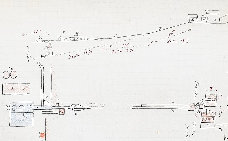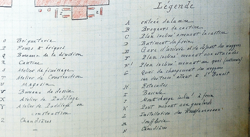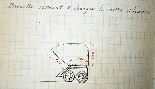 « La carrière de castine se trouve à 50 m plus haut que l’entrée de la mine de même que celle-ci est à 50 m au-dessus du sol de l’usine. » « Un plan incliné analogue au précédent amène la castine depuis la carrière jusqu’au carreau de la mine. Autrefois, on se contentait de détacher les wagons arrivés en A (cf. plan ci-dessus) pour les reporter au deuxième plan incliné. Le cassage du minerai s’effectuait en même temps que celui de la castine aux estacades. Aujourd’hui, la castine est broyée dans des appareils spéciaux disposés en A. »