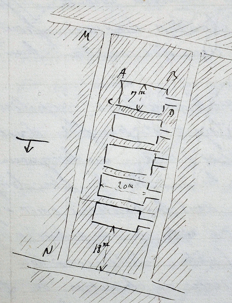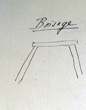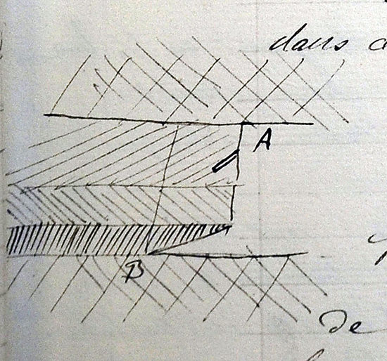 « Pour abattre, on creuse à la partie inférieure dans ce qu’on appelle le creusage. Cette opération se fait à la pique. On enfonce alors en A un fort coin. Toute la portion AB s’effondre alors. Cette opération se paie à raison de 1 franc à 1,20 franc par tonne extraite dans les chantiers. Chaque ouvrier extrait 4 tonnes par jour en moyenne. La mine emplois 90 ouvriers sur lesquels 75 sont attachés à l’extraction. La mine donne 300 tonnes par jour. On ne travaille pas la nuit. »