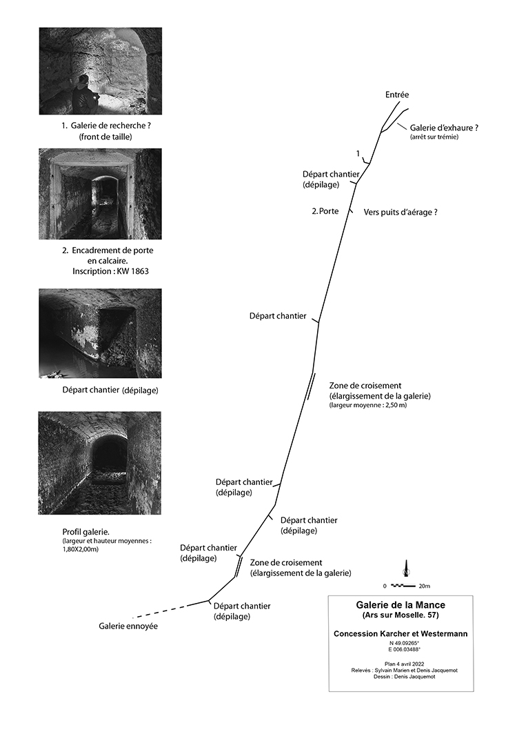 Une tranchée bien marquée se prolonge par plusieurs entonnoirs. Un mur en pierre sèche marque le début de la tranchée (entrée galerie ?) et deux soubassements de bâtiments situés en contre bas. |