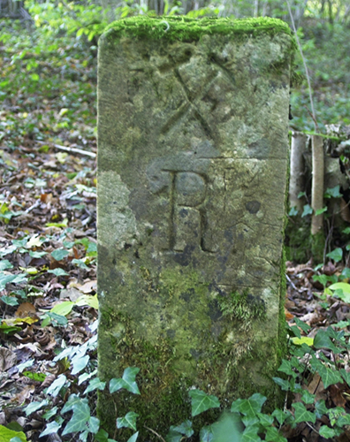Borne de concession avec le marteau et la pointerolle. A proximité, une série de bornes basaltiques qui délimite les communes de Vaux et d’Ars. On retrouve des bornes semblables au-dessus de la vallée de la Mance. |