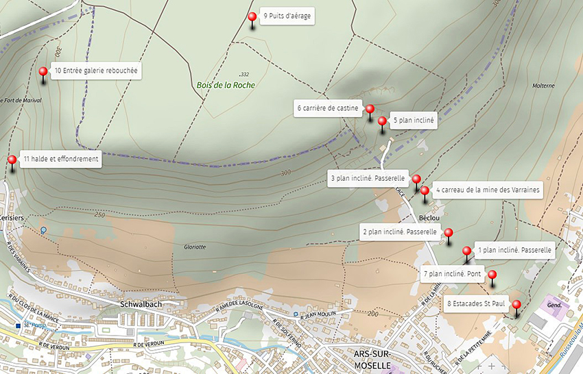 Il s’agit probablement d’un puits d’aérage de la mine des Varraines. Nombreux tas de déblais où l’on retrouve des marnes. Section rectangulaire environ 2 m sur 1 m. Profondeur actuelle environ 6 m. |