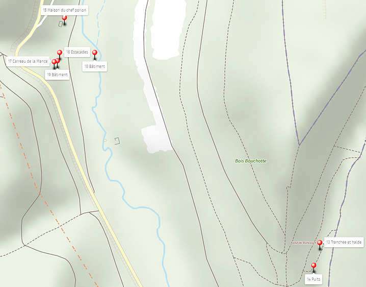 Aménagement au niveau du carreau de la mine, sans doute le départ du plan incliné qui menait aux estacades situées en contrebas. |