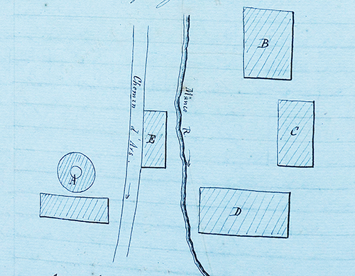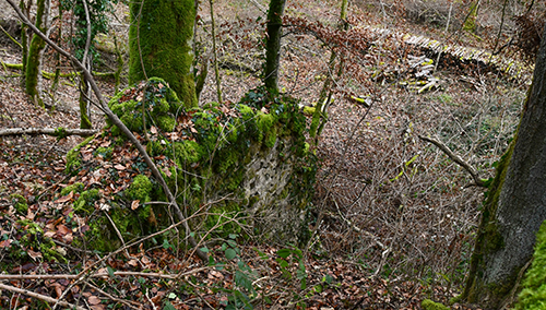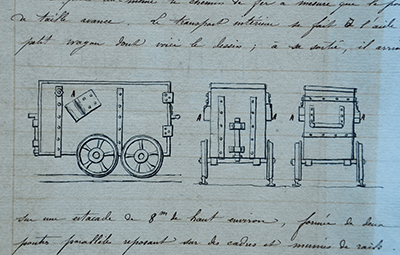 « A sa sortie, il arrive sur une estacade de 8 m de haut environ, formée de deux poutres parallèles reposant sur des cadres et munis de rails. Arrivé à une certaine distance, le wagon peut se bailler facilement et les deux oreilles A (cf schéma ci-dessus) l’empêchent de décrire une circonférence. Le minerai est repris au pied de l’estacade et conduit au moyen de chevaux jusqu’à l’usine située à environ 3 km. On établit en ce moment un petit chemin de fer à chevaux qui diminuera de beaucoup le prix du transport. » « Dans le même vallon, mais sur l’autre colline, une galerie de recherche de 180 m de long (Galerie Pillot) a été ouverte au-dessous du niveau probable de la couche et présente alors une légère inclinaison. Des dépôts isolés de minerai ont été traversés plusieurs fois. A 150 m environ, il y a un ressaut de 6 m. On espère trouver la mine en place à 250 m. On avance en moyenne de 0,75 m par jour (un seul poste de 12h). Il faut comme à la minière principale un boisage complet dont le prix de revient est de 7 francs par mètre courant. »